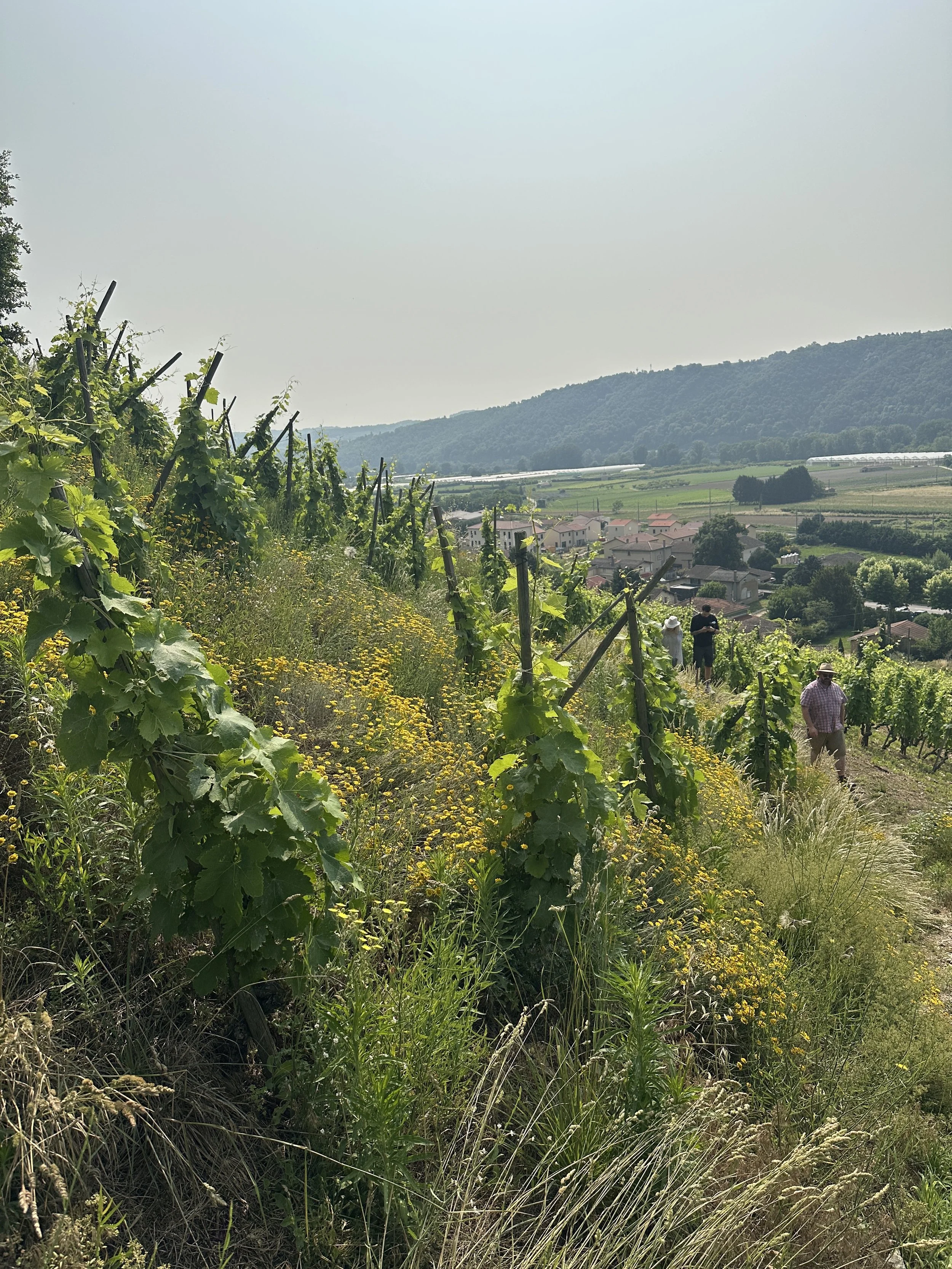 “The Roasted Slope” of Cote Rotie. The schist cliffs were buring hot that day, the dark red grapes ripening in the bright sunlight. The near vertical vineyard required some serious effort to summit!